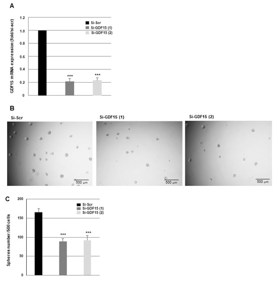 Down-regulation of GDF15 decreases the sphere-forming ability of GSCs. GSC02 expressing for 48 h specific siRNAs against GDF15 (si-GDF15(1), si-GDF15(2)) or a scramble control (si-Scr) were used for (A) GDF15 mRNA expression analyzed by real-time PCR, using GAPDH for normalization or (B,C) for neurosphere-forming analysis as described in “Methods”. Quantifications of three experiments are presented as mean ± SD. *** p < 0.001.