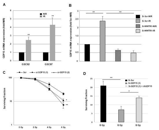 In accordance with our results, which showed a regulation of GDF15 expression by IR in the GSCs, it was previously published that IR could also induce the expression and secretion of this cytokine in oral carcinoma cells [34,35]. Similarly, it was shown that IR regulates GDF15 expression by cells in the tumor microenvironment, including macrophages, fibroblasts, or endothelial cells [11,36,37]. In particular, GDF15 secretion by irradiated endothelial cells has been shown to contribute to angiogenesis in GBM models [11].