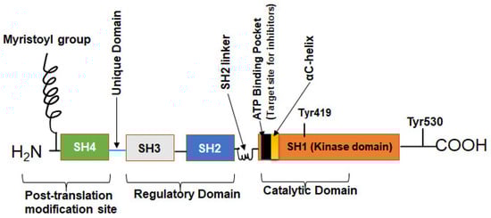 The structure of the human c-Src. The human Src protein is an orderly arrangement of four SH domains with N and C terminals. The C-terminal is the tail and anchors a regulatory tyrosine—Tyr530. SH1 domain is the highly catalytic tyrosine kinase (TK) domain with Tyr419 for substrate phosphorylation, ATP/inhibitor binding pocket, and an αC-helix. SH2 and SH3 domains are the regulatory domains that can bind phosphorylated Tyr530 and polyproline helix, respectively. The SH4 domain is the disordered segment and myristoylation site for membrane association [24,25].