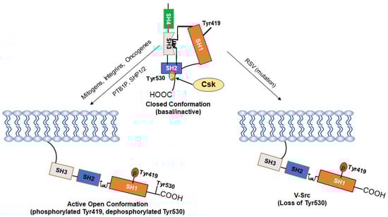 c-Src is a 60 kDa protein encoded by the Src gene belonging to a family of non-RTK known as SFK. As a typical protein, the polypeptide sequence of c-Src comprises an N-terminal head and a C-terminal tail but has four Src homology (SH) domains numbered 1, 2, 3, and 4 (Figure 1) [24,25]. The SH1 domain is the active enzymatic kinase segment that bears a swinging amino acid tyrosine—Tyr 416 in chicken Src (Tyr 419 in humans). A linker region next to this domain is followed by the SH2 and SH3 domains. The SH2 and SH3 domains function as an on/off switch for the Src in conjunction with the C-terminal tail. The last domain is the N-terminal SH4 domain; this domain is the leading site of co-translational modification by myristoylation (c-Src and Blk) and post-translational change (other members of SFKs) by palmitoylation [4,26,27]. The C-terminal tail consists of a carboxy group that is short and connected to the SH1 domain. Additionally, the C-terminal domain serves as an anchor for a phosphotyrosine moiety, specifically Tyr530 in human Src (or Tyr527 in chicken). This allows it to function as a regulatory unit. Figure 2 shows how the basal activity of c-Src is maintained during normal physiological conditions and the mechanism of its activation. The presence of an intrinsically disordered segment, known as the unique domain (UD), is responsible for the variation among SFKs. This domain lies between the SH4 and the SH3 polypeptide domain [26]. The structure of c-Src is a fuzzy complex of different SH1, 2, 3, and C-terminal domains, which are coiled up into a twist. At the same time, the SH4 and the UD are somewhat intrinsically disordered [28].