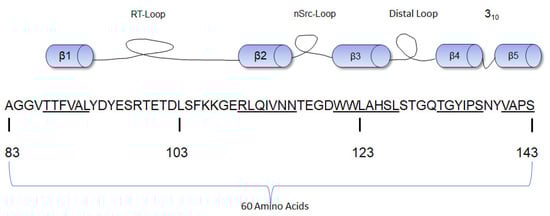 The SH3 domain consists of a fold of five β-strands of approximately 60 amino acid residues (Figure 3) with three hydrophobic cavities that act as the ligand-binding domain [48]. Anatomically, the ligand-binding motif of the SH3 domain binds proline-rich sequences, especially those with PxxP motifs. The PxxP motif is found in class I (those with R/KxXPxXP sequence) and II peptides (those with XPxXPxR/K sequence) where “X” represents non-glycine hydrophobic residues and “x” represents natural amino acid residues [48]. These residues are often orientated to form a left-handed polyproline helix that exhibits pseudo-syllogism [49]. The SH3 domain recognizes and binds the proline-rich motifs; these interactions help to further stabilize the closed conformation and maintain c-Src in a folded inactive state [50]. The molecular structure analysis of the SH3 domain of c-Src by X-ray crystallography and nuclear magnetic resonance (NMR) shows three main loops that allow the five β-strands of the SH3 domain to maintain their folds [51]. The Src kinase SH3 domain contains three loops: the RT Src loop, the n-Src loop, and the distal loop. The RT Src loop is composed of two main amino acid residues, arginine (R) and threonine (T) [52]. The RT loop also interconnects with the β1 and β2 strands, the n-Src loop interconnects the β2 and β3 strands, and the distal loop interconnects the β3 and β4 strands [53]. These loops also form hydrogen bonds and van der Waals forces with the SH1 domain [31]. The RT (residues 98–103) and n-Src (residues 114–116) loops of the SH3 domain contain a lipid-binding region positioned antithetically to the hydrophobic peptide cavities. This lipid-binding region has the potential to bind the SH4 domain [54]. A W118A mutant (Src-Y527/W118A) with mutations in the SH3 domain did not abolish the interaction of Src with partner molecules. This suggests that this domain is not essential to halting the kinase activity of c-Src [37]. The SH3 domain is next to the SH2 domain, and the hydrophobic amino acid residues on these domains interact via a helical twist [31].