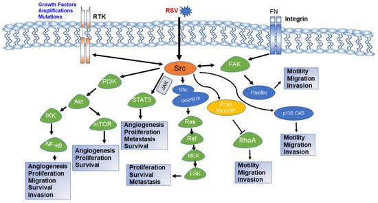 Schematic diagram of Src intracellular signaling pathway and various cellular processes controlled by each pathway. Activation of RTK, integrin signaling, or viral integration activates c-Src. Activated c-Src activates downstream PI3K-AKT, STAT3, Ras-MAPK, and FAK pathways and regulates various cellular functions required for normal growth and development as well as carcinogenesis and drug resistance. The both-way arrow indicates that the components can be activated by each other [88,89,90,91,92].