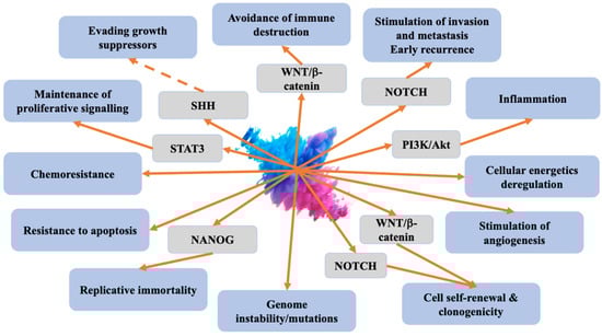 The observed relationship between CSCs and other cells within the tumour microenvironment (TME) suggests that developing novel therapeutics targeting CSC-TME interactions holds the potential to enhance clinical outcomes []. Main molecular mechanisms and signalling pathways related to CSCs are presented in Figure 1.