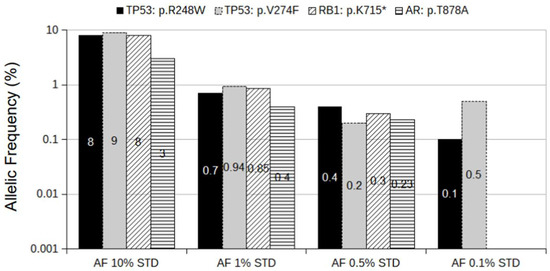 To assess the performance of our targeted sequencing approach, we generated four different spiked-in allelic frequency (AF) standards using PCa cell lines. Targeted sequencing of the three cell lines (DU145, LNCaP, and VCaP) revealed the presence of four mutations at 100% AF (Supplementary Table S2). The specificity of the panel was analyzed by mixing the DNA of three different cell lines (DU145, LNCaP, and VCaP) into the wild-type background. Spiked-in standards contained a mix of four mutations present in the AF standard at the following allelic frequencies: 10%, 1%, 0.5%, and 0.1%. All libraries were prepared with 22 ng of total DNA to reach the theoretical Limit of Detection (LOD) of 0.1% AF. While all four mutations were detected in the 10%, 1%, and 0.5% AF standards, only two were detected in the 0.1% AF standard (Figure 1). These data suggest that our approach’s sensitivity is 100% at an AF of 0.5%. However, mutations at lower AF can also be detected, but with significantly lower precision.