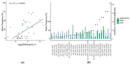 Concordance analysis of the matched tumor and liquid biopsy. (a) Correlation between AF and cfDNA amount in plasma (n = 48). Pearson correlation R = 0.57, p = 0.000025; (b) Concordance analysis of matched tumor biopsy and plasma cfDNA with regards to detected somatic variants. cfDNA amount (ng/mL) for each patient sample is indicated with a black dot. The x-axis displays the sample names, along with the corresponding gene names and observed amino-acid change.
