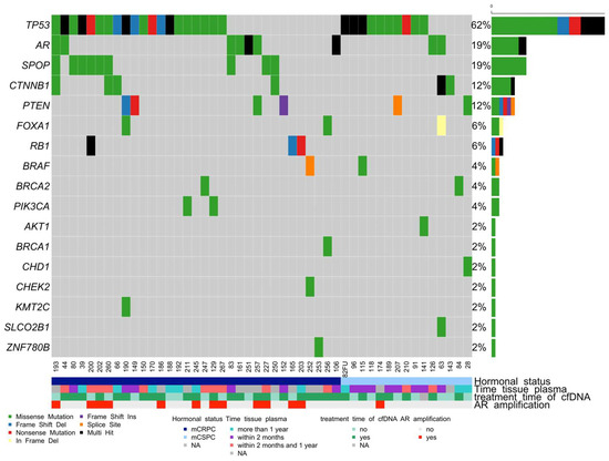 OncoPrint shows the distribution of genetic alterations in the cfDNA of mCRPC and mCSPC patients. Legend provides an overview of the types of genetic alterations in the genes (rows) of the individual samples (columns). Somatic mutations have been detected in 48 of the 68 cfDNA samples. Multi-hit refers to samples with more than one type of somatic variant.