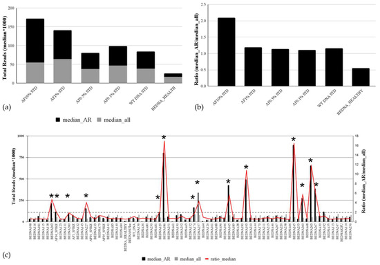 Copy number variation in the plasma cfDNA of mPCa patients. The analytical sensitivity of the targeted cfDNA panel for AR amplification detection is based on median values for total coverage for AR amplicons and all other amplicons of other genes covered by the panel (a) and on their ratio (b). (c) AR amplification analysis in cfDNA samples of 68 mPC patients. The median values of total reads for AR amplicons and the median value of the total number of reads for all other amplicons in all tested plasma cfDNA samples are presented in columns. The ratio of median values is shown with a red line. Samples with AR amplifications are indicated with an asterisk (*).