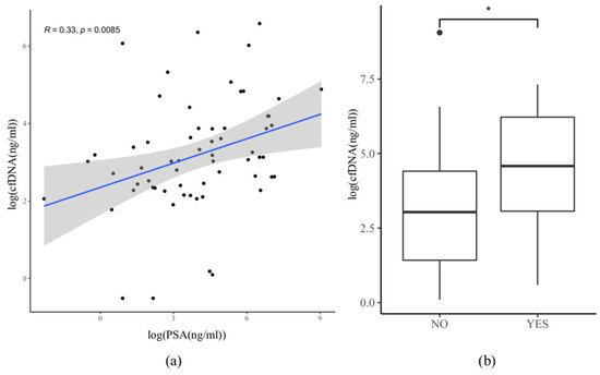 Correlation between PSA level and cfDNA amount in plasma. Data log(x) transformation were performed for better graphical visualization of the data due to the presence of outliers. (a) Correlation plot of pairwise estimates of cfDNA and PSA concentration in plasma (n = 62). y-axis: cfDNA concentration (ng/mL) in plasma. x-axis: PSA concentration (ng/mL) in serum. Pearson coefficient R = 0.33, p = 0.0085; (b) Correlation between PSA levels (ng/mL) and plasma cfDNA samples positive (YES) or negative (NO) for somatic mutation. Wilcoxon–Mann–Whitney test, p = 0.03 (*).