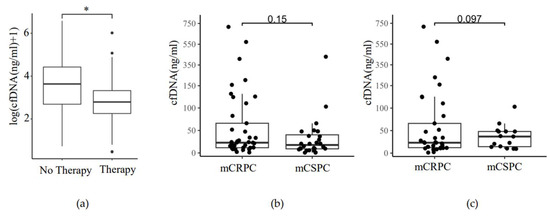 Plasma cfDNA level in response to ADT-ARSI therapy and hormonal status of mPCa. (a) ADT-ARSI therapy reduces plasma cfDNA in mPCa. Therapy: patients on ADT or ARSI therapy at the time or shortly before the blood withdrawal (n = 43). No therapy: patients without treatment at the time of blood withdrawal (n = 26). Wilcoxon–Mann–Whitney test, p = 0.031 (*); (b) cfDNA amount in plasma of mCRPC and mCSPC patients. y-axis: total cfDNA amount (ng/mL) in plasma. x-axis: Hormonal status (mCRPC (n = 40), mCSPC (n = 28)), Two-Tailed t-test, p = 0.15; (c) cfDNA amount in plasma of mCRPC and mCSPC patients positive for somatic variant. y-axis: total ctDNA amount (ng/mL) in plasma. x-axis: Hormonal status (mCRPC (n = 33), mCSPC (n = 15)), Two-Tailed t-test, p = 0.097.