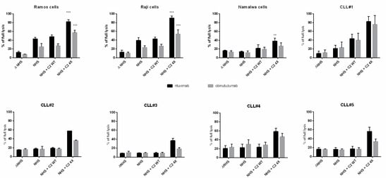 Previously, we characterized several human CD20+ cell lines according to their sensitivity to type I anti-CD20 antibodies []. Three of these cell lines of high (Ramos), moderate (Raji), and low (Namalwa) sensitivity were selected for the current experiments. In each of the cell lines tested, the addition of hyperactive C2 to obinutuzumab resulted in an increase of complement-mediated lysis that outperformed the readout obtained for cells sensitized with the type I anti-CD20 mAb rituximab (Figure 1). Importantly, no effect was observed when wild-type C2 was used instead of the GoF variant. In the same experimental setup, the GoF variant added to the serum without anti-CD20 mAbs caused no significant cytotoxicity (Supplementary Figure S1). The same experiment was repeated on fresh cultures of CLL cells obtained from the patients. CLLs are considered relatively resistant to the CDC initiated by type I anti-CD20 mAbs and represent a model closely related to challenges met during clinical practice. We examined CLL cells from five donors, and in all cases, we observed the same phenomenon as in the experiments with cell lines, i.e., enforcement of CDC initiated by obinutuzumab supplemented with the GoF C2 variant, which yielded higher lysis than obtained with rituximab with no C2 supplementation.