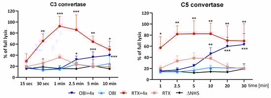 The activity of classical complement convertases formed on the platforms of rituximab and obinutuzumab. Classical C3 (left graph) and C5 (right graph) convertases were formed on the surface of Ramos cells incubated with 10% normal human serum (NHS) supplemented with obinutuzumab (OBI) or rituximab (RTX) in two conditions: with and without addition of the hyperactive C2 variant (4×). Data are averages from three independent experiments (n = 3), and the symbols *, **, and *** depict statistically significant differences between cells treated with the given antibody supplemented with 4× and the WT variant of C2 at p < 0.05, p < 0.01, or p < 0.001, respectively, according to Sidak’s multiple comparison test. Error bars show standard deviation (SD).