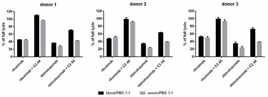 The results of in vivo experiments in mouse mAb-sensitized lymphoma cells showed that complement activation and Fc-receptor-mediated effector mechanisms such as ADCC are competitive with each other []. In vitro study suggests that at the level of a single target cell, fixation of early complement components constitutes a steric hindrance that disables the adhesion of NK cells to their target via CD16/FcγRIII []. However, in practice, these two mechanisms may act in concert when the population of tumor cells is heterogeneous in terms of the expression of target antigens or when the availability of effector cells is not insufficient regarding the tumor burden. Van Meerten and coworkers showed that the threshold of CD20 expression necessary for CDC activation is substantially lower than the threshold for effective engagement of NK cells []. Therefore, we attempted to find out whether the enhancement of CDC initiated by obinutuzumab in the presence of a hyperactive C2 variant will persist in a whole blood environment when FcR-bearing cells are present. For this purpose, blood coagulation was performed with hirudin, which does not affect complement activity, unlike other commonly used anticoagulants []. We examined blood collected from three individuals, and, on the same occasion, we separately examined sera collected from the same people (Figure 3). The experiment performed on Raji cells revealed that upon addition of the GoF C2 variant to whole blood, the enhancement of CDC initiated by obinutuzumab was observed. Surprisingly, such an enhancement outperformed the analogous increase observed in serum, whereas the CDC ratio in rituximab-treated cells was similar in whole blood and serum. This result suggests that in the context of short-term cytotoxicity, obinutuzumab may benefit from complement as its additional effector mechanism in the physiological environment of whole blood.