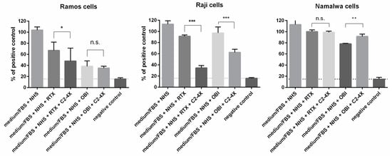 XTT assay performed for 24 h in complete culture medium. The principles of the XTT assay were to enable the proliferation of cells that resisted CDC and, at the same time, to expose them to the direct cytotoxic effect of anti-CD20 mAbs. The background (negative control, dashed lines) level was considered as the XTT conversion in medium without cells, and the positive (100%) control was set as the readout obtained for cells kept in complete medium without human serum. Data are averages from at least three experiments (n ≥ 3), and the symbols *, **, and *** depict statistically significant differences between cells treated with the given antibody supplemented with 4× and the WT variant of C2 at p < 0.05, p < 0.01, or p < 0.001, respectively, according to Sidak’s multiple comparison test. Error bars show standard deviation (SD).
