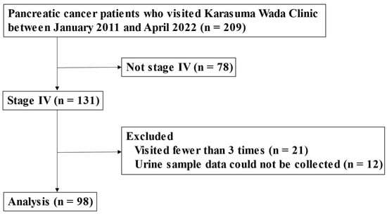 Above is a flowchart showing the number of patients analyzed in this study. Of the 209 patients with pancreatic adenocarcinoma who visited Karasuma Wada Clinic between January 2011 and April 2022, 131 were diagnosed as having stage 4 cancer. After excluding 21 patients who visited fewer than 3 times and 12 patients for whom urine samples could not be collected, a total of 98 patients were included in the analysis. The study population included 25 patients from our previous study [15].