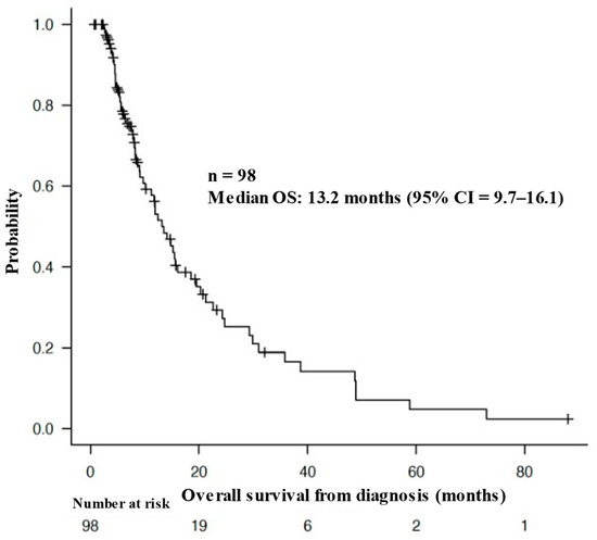 Above is a Kaplan–Meier curve of the overall survival (OS) of the patients from the time of diagnosis. The median OS of all patients from the time of diagnosis was 13.2 months (95% CI = 9.7–16.1 months).