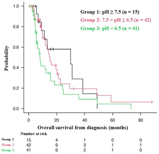 The median OS of all patients from the time of diagnosis was 13.2 months (95% CI = 9.7–16.1 months), as shown in Figure 2. Figure 3 shows the Kaplan–Meier curves for the OS of patients stratified by mean urine pH levels, as follows: those with a mean urine pH of 7.5 or higher, those with a mean urine pH of 6.5 to less than 7.5, and those with a mean urine pH of less than 6.5. The median OS was 29.9 months for the 15 patients with a mean urine pH of 7.5 or higher (95% CI = 9.1–38.7), 15.2 months for the 42 patients with a pH between 6.5 and less than 7.5 (95% CI = 10.1–21.2), and 8.0 months for the 41 patients with a pH of less than 6.5 (95% CI = 5.6–15.5). Although these results did not reach statistical significance, there was a discernible trend, i.e., higher urine pH correlated with extended OS (p = 0.0639).