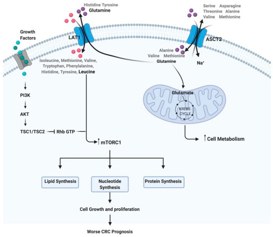 Steps of the amino acid system. For example: how glutamine and leucine levels can interfere with cell metabolism, growth, and proliferation, implying a worse prognosis in CRC (reprinted with permission—Dias et al., 2021 [11]).