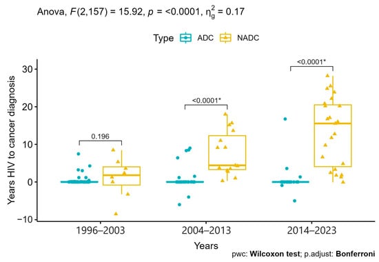 The two-way ANOVA and Mann–Whitney–Wilcoxon test were adopted to compare numerical variables, particularly time from HIV to cancer diagnosis, between ACD and NADC over the three decades.