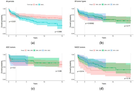 Survival probabilities for all periods (a), all tumor types (b), ADC (c), and NADC (d). Significance values for variations in long- (15-year) and short-term (2-year) survival by group were determined with the log-rank test.