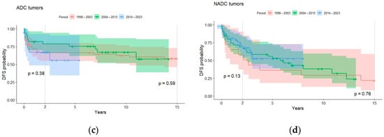 Disease-free survival probabilities for all periods (a), all tumor types (b), ADC (c), and NADC (d). Significance values for variations in long- (15-year) and short-term (2-year) survival by group were determined with the log-rank test.
