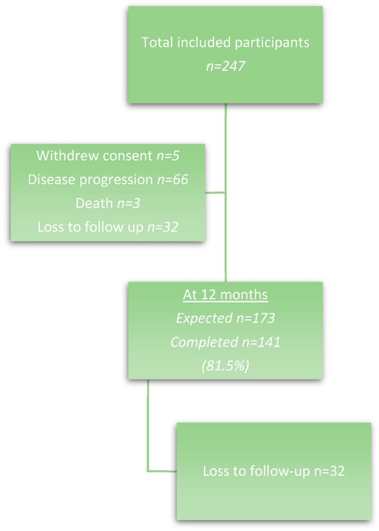 A total of 293 patients were recruited to the SOCQER-2 study from 12 cancer centres in the UK (n = 235) and one centre in India (n = 58). After completion of their surgical intervention and final histopathology, 247 (84%) were eligible to be included in the SOCQER-2 study. Of the 247 patients, 66 patients (27%) had disease progression at 12 months and 3 patients (1%) died. Five patients (2%) withdrew consent. Therefore, 173 patients were eligible to complete the mental health impact questionnaires at 12 months. A total of 32 out of the 173 patients (13%) were lost to follow-up, leaving a total of 141 patients (Figure 1). The patients were predominantly White (66.7%), followed by those of South Asian ancestry (29.1%).