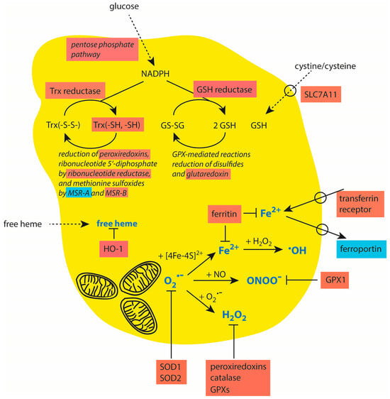 | Thioredoxin system (thioredoxin, thioredoxin reductase; NADPH) | Removal of H2O2, redox homeostasis | Lung, breast, prostate, colorectal, pancreatic, hepatocellular, gastric, and other carcinomas | [255,256] |