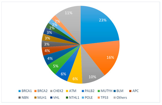 Spectrum of identified genetic variants. “Others” include the following genes: PMS2, MSH, BARD1, MSH2, MEN1, MSH6, CDKN2A, EPCAM, TSC2, GALNT12, MLH3, and BRIP1.