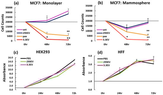 3.1. NK3.3-Derived EVs Kill Breast Cancer Cells in Monolayer and Mammosphere Cultures