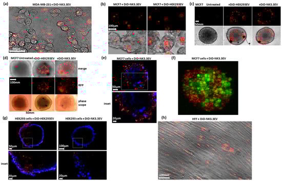 3.4. NK3.3-Derived EVs Are Taken up and Internalized by Cells Grown in Monolayers, Mammospheres, and 3D Cultures
