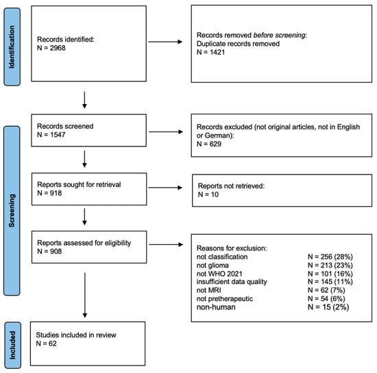 Overall, 2968 search results were reviewed, and 908 reports were retrieved in full-text version. Causes for exclusion and their proportion are shown in Figure 1. After excluding non-human studies reporting findings from animal models or cell lines (N = 15, 2%) and studies reporting CT or PET data (N = 62, 7%), 831 studies remained. Of these studies, 213 (26%) focused on non-gliomas, mainly brain metastases, meningiomas, or posterior fossa tumors, and 256 (31%) analyzed algorithms for tumor detection or segmentation and were consecutively excluded from this review. Of the remaining 362 studies, 54 (15%) focused on correlates of post-therapeutic glioma progression and pseudoprogression. Afterwards, 308 papers remained, out of which 101 (33%) were excluded due to no reference or allusion to the 2021 WHO classification despite being published in 2022 or later. Of the remaining 207 studies, 145 (75%) were excluded due to concerns related to data quality or presentation (lack of information on patient cohort, grading criteria, imaging sequences, hold-out testing cohort, or AUC results). The remaining sixty-two original high-quality articles analyzing the utility of novel MRI techniques and data analysis algorithms for the classification of neuroimaging data, according to WHO 2021, were thus included in this scoping review. The 2-year impact factor of the publishing journals ranged from 1.8 to 15.9 [] with a mean IF of 4.5 ± 2.6 and only 17 out 62 (27%) manuscripts published in a journal with an IF above 5.