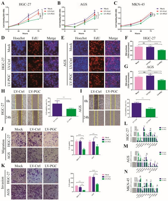 PGC inhibits GC cell proliferation, migration, invasion, and EMT in vitro. (A–C) Cell viability was measured by using CCK-8 assay after the transfection of HGC-27 (A), AGS (B), and MKN-45 (C) cells with LV-PGC and LV-Ctrl, and the results suggested that PGC inhibited cell viability. (D–G) Cell proliferation was evaluated by using EdU assay after the transfection of HGC-27 and AGS cells with LV-PGC and LV-Ctrl. Representative images of EdU assays (D,E) and the EdU incorporation percentage (F,G) revealed that overexpression of PGC inhibited cell proliferation. (H,I) Cell motility was examined with a wound healing assay in HGC-27 and AGS cells transfected with LV-PGC and LV-Ctrl. Representative images and the cell mobility ratio revealed that PGC inhibited GC cell migration. (J,K) Migration and invasion of HGC-27 and AGS cells transfected with LV-PGC and LV-Ctrl were determined using transwell migration and invasion assays. Representative images of transwell assays and the number of cells passing through the chamber revealed that PGC inhibited GC cell migration and invasion. (L–N) qRT-PCR analysis of the expression levels of EMT-associated markers E-cadherin, N-cadherin, vimentin, Snail, Slug, Twist, fibronectin, MMP2, and MMP9 in HGC-27 (L), AGS (M), and MKN-45 (N) cells transfected with LV-PGC and LV-Ctrl. The results suggested that PGC regulated the expression of EMT biomarkers. Data are shown as means ± SEM; * p < 0.05, ** p < 0.01, *** p < 0.001, ns: no significance, scale bar, 100 mm.