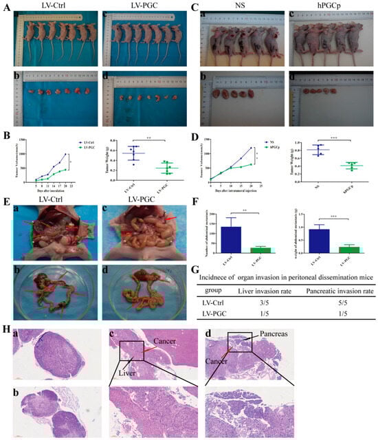 PGC inhibits GC cell growth and metastasis in vivo. (A,B) MKN-45 cells stably expressing PGC (LV-PGC) showed inhibited subcutaneous tumor growth compared with the negative control vector group (LV-Ctrl). Representative images of the macroscopic appearance of subcutaneous nodules (A) and the tumor volume over the entire period and tumor weight at the end point (B) (n = 7 per group). (C,D) MKN-45 cells were subcutaneously injected into nude mice to create a subcutaneous tumor model. Intratumoral injection of hPGCp significantly inhibited subcutaneous tumor growth compared to the injection of the NS group. Representative images of the macroscopic appearance of subcutaneous nodules (C) and the tumor volume over the entire period and tumor weight at the endpoint (D) (n = 5 per group). (E–H) MKN-45 cells stably expressing PGC (LV-PGC) showed inhibited peritoneal dissemination compared to the negative control vector group (LV-Ctrl). Representative images of the macroscopic appearance of peritoneal dissemination nodules, red arrows indicate the representative peritoneal dissemination nodules. (E), the number and weight of abdominal metastasis nodules (F), the incidence of organ invasion in mice with peritoneal dissemination mice (G), and H&E staining of peritoneal dissemination nodules as well as the invasion of the liver and pancreas (H). (a,b) show pathological images of abdominal metastasis nodules in the LV-Ctrl and LV-PGC groups, respectively, while (c,d) show representative pathological images of liver invasion and pancreatic invasion in the LV-Ctrl group (n = 5 per group). Data are shown as means ± SEM; * p < 0.05, ** p < 0.01, *** p < 0.001.