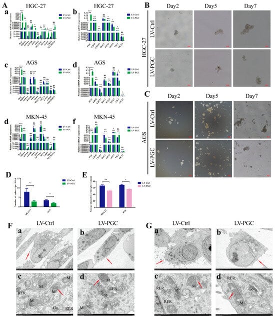 PGC promotes differentiation and inhibits the stemness of GC cells. (A) qRT-PCR analysis of the expression levels of mature differentiation markers and dedifferentiation markers in gastric mucosa epithelium in HGC-27 (a,b), AGS (c,d), and MKN-45 (e,f) cells transfected with LV-PGC and LV-Ctrl. The results revealed that PGC promoted the expression of mature differentiation markers of gastric mucosa but inhibited the expression of biomarkers of progenitor cells and GC stem cells. (B–E) The stem-cell-like phenotype of HGC-27 and AGS cells transfected with LV-PGC and LV-Ctrl was determined using sphere formation assays. Representative images of spheres on day 2, day 5, and day 7 (B,C), the number of spheres per field (D), and the average sphere diameter (E) showed that PGC significantly reduced the sphere-forming efficiency of GC cells. (F,G) Representative images of the subcellular morphological structure characteristics of HGC-27 (F) and AGS (G) cells revealed that PGC-overexpressing cells exhibited more differentiated subcellular structure characteristics. (a,b) Microvilli on the cell surface (shown by the red arrows, magnification, ×2.0 k). (c,d) The intracellular mitochondria (M) (shown by the red arrows) and mitochondrial crista, rough endoplasmic reticulum (RER), and Golgi apparatus (Go) (magnification, ×15.0 k). Data are shown as means ± SEM; * p < 0.05, ** p < 0.01, *** p < 0.001, ns: no significance.
