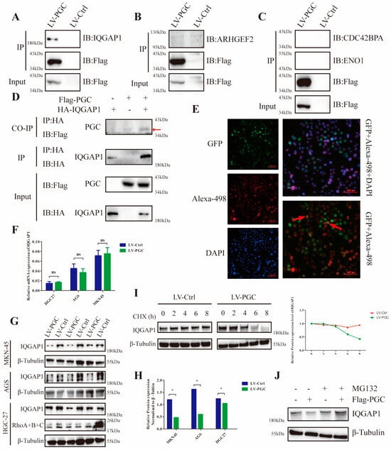 PGC interacts with IQGAP1 and interferes with IQGAP1 protein stability in GC cells. For the Co-IP assays, AGS cells were transfected with FLAG-PGC, and the FLAG fusion magnetic beads were used for pulldown analysis. (A–C) FLAG-PGC interacts with IQGAP1 (A), but not ARHGEF2 (B), CDC42BP2, or ENO1 (C). (D) HA-IQGAP1 interacts with FLAG-PGC in GC cells, indicating that PGC and IQGAP1 can interact with each other. The AGS cells were cotransfected with HA-IQGAP1 and FLAG-PGC. HA fusion magnetic beads were used for pull-down analysis, and anti-HA antibodies as well as anti-FLAG antibodies were used for WB. The red arrow points to the band of interest. (E) PGC and IQGAP1 are co-localized in the cytoplasm, as demonstrated by immunofluorescence staining analysis. The red arrows indicate the representative overlap of green fluorescence with red fluorescence. (F–H) qRT-PCR and WB were used to determine the expression level changes of IQGAP1 in HGC-27, AGS, and MKN-45 cells transfected with LV-PGC and LV-Ctrl. The results showed that PGC decreased the expression of the IQGAP1 protein rather than the mRNA, which suggested that the effect of PGC on IQGAP1 may be at the post-transcriptional level. (I) AGS cells treated with CHX (100 µM/mL) revealed that PGC overexpression accelerated the degradation of IQGAP1. (J) AGS cells treated with MG132 for 6 h showed that the downregulation of IQGAP1 protein induced by PGC was rescued by the proteasome inhibitor MG132. PGC may decrease the protein stability of IQGAP1 by affecting its ubiquitination level. Data are shown as means ± SEM; * p < 0.05, ns: no significance. The uncropped bolts are shown in Supplementary Materials.