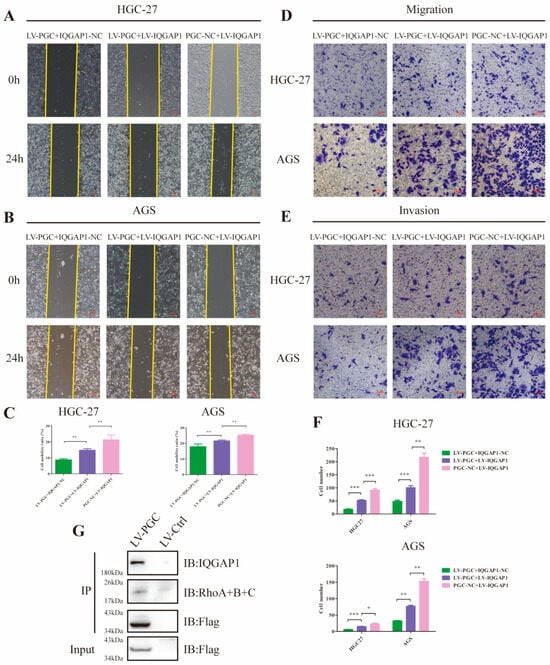 PGC inhibits GC cell migration and invasion by reducing IQGAP1 and suppressing Rho-GTPase signaling. (A–C) Cell motility was examined using wound healing assays in HGC-27 and AGS cells transfected with LV-PGC + IQGAP1-NC, PGC-NC + LV-IQGAP1, and LV-PGC + LV-IQGAP1. Representative images (A,B) and the cell mobility ratio (C) revealed that increased expression of IQGAP1 counteracted the effects of PGC overexpression on cell motility. (D–F) The migration and invasion of HGC-27 and AGS cells transfected with LV-PGC + IQGAP1-NC, PGC-NC + LV-IQGAP1, and LV-PGC + LV-IQGAP1 were determined using transwell migration and invasion assays. Representative images (D,E) of transwell assays and the numbers of cells passing through the chamber (F) revealed that IQGAP1 counteracted the effects of PGC overexpression on cell migration and invasion. Data are shown as means ± SEM; * p < 0.05, ** p < 0.01, *** p < 0.001. (G) FLAG-PGC can interact with Rho. AGS cells were transfected with FLAG-PGC. For the Co-IP assays, FLAG fusion magnetic beads were used for pull-down analysis, and anti-RhoA + B + C antibody was used for WB. The uncropped bolts are shown in Supplementary Materials.
