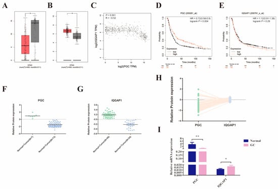 PGC expression in GC is significantly negatively correlated with IQGAP1. (A–C) The mRNA expression level of PGC (A) and IQGAP1 (B) and the correlation of their expression (C) were determined by using the GEPIA2 database, which suggested that PGC expression is negatively correlated with IQGAP1 at the mRNA level. The red section represents tumor tissue, and the gray section represents normal tissue. The data are shown as means ± SEM; * p < 0.05. (D,E) The prognostic roles of PGC (D) and IQGAP1 (E) mRNA expression in GC were determined by using the Kaplan-Meier Plotter database. (F–H) The protein expression levels of PGC (F) and IQGAP1 (G) and the expression correlation (H) were determined by using the CPTAC database, which showed that PGC expression is negatively correlated with IQGAP1 at the protein level. (I) The mRNA expression data of 20 paired GC tissues and the correlated normal tissues revealed that PGC was downregulated while IQGAP1 was upregulated in GC tissues. The data are shown as means ± SEM; * p < 0.05, ** p < 0.01.