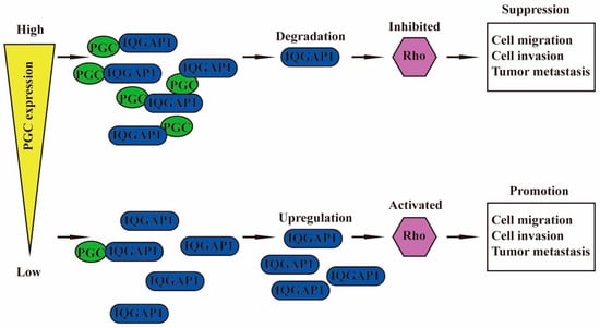 IQGAP1 is a scaffold protein containing several domains that mediate protein interactions [25,26,27]. As an oncogene, IQGAP1 can bind to several proteins and then participate in various biological activities, such as cytoskeleton dynamics, cell adhesion, cell motility, cell invasion and metastasis, and cell proliferation [28,29,30]. Results of this study suggested that PGC overexpression can downregulate IQGAP1 protein expression and significantly inhibit migration of GC cells, and that effect can be restored by IQGAP1 overexpression, which suggested that the regulation of IQGAP1 by PGC plays an important role in inhibiting the migration and invasion of GC cells. As a key node of the small GTPase network, IQGAP1 is a major regulator of several GTPases, of which the Rho family is the most important class of small GTPases that interact with IQGAP1 [31]. Multiple studies have proven that IQGAP1 is significantly associated with the Rho-GTPase pathway, and the binding and regulation of its GRD domain to the Rho-GTPase pathway proteins plays an important role in tumor invasion and metastasis [32,33,34,35]. In this study, the relationship between PGC-IQGAP1 and the Rho-GTPase pathway was investigated. Compared to the control group, PGC overexpression downregulated not only the IQGAP1 protein but also the Rho protein expression. Based on the above research results, we hypothesize that one of the mechanisms by which PGC inhibits the migration and invasion of GC cells may be by promoting the downregulation of the IQGAP1 protein via interacting with IQGAP1 and thereby inhibiting the expression of Rho protein in the Rho-GTPase pathway, with ultimate inhibitory effects on GC cell migration and invasion. In addition, we found that the upregulation of PGC can shorten the half-life of the IQGAP1 protein, suggesting that PGC can reduce the stability of the IQGAP1 protein. Studies have found that the high ubiquitination level of IQGAP1 can reduce its expression and its interaction with and activation of Rho-GTPase, thereby inhibiting tumor metastasis. Further experiments are needed to verify whether PGC inhibits GC cell migration and invasion by affecting the ubiquitination level of IQGAP1.