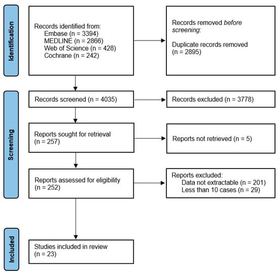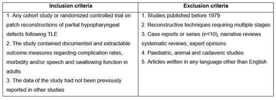 A systematic literature review was performed to identify all studies investigating reconstructive methods for partial hypopharyngeal defects following TLE, using the Embase, Medline, Web of Science and Cochrane libraries. Studies reported in English between 1979 and 2023 were analyzed according to the PRISMA 2020 statement [8]. Articles were first assessed for eligibility based on title and abstract. The full-text article was obtained and evaluated if the study was not excluded based on the abstract. All abstracts and full-text articles were assessed separately by two independent reviewers (A.M.T. and R.L.). In addition, we added our own retrospective single-center data, including all consecutive patients who underwent a pectoralis major-flap reconstruction following TLE with a partial hypopharyngectomy between 1 January 2000 and 1 April 2022, and a consecutive cohort of patients that received an RFFF reconstruction [9].
