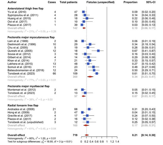 Only 8 out of 23 studies described the management of fistulas in a qualitative manner [7,11,13,14,21,22,31]. Therefore, the occurrence of persistent fistulas requiring surgical treatment could not be determined for most studies. Fistulas—regardless of their management—were most frequently reported following PMMC flaps (n = 145/360, 40%), followed by RFFFs (n = 32/160, 20%), ALTFFs (n = 14/142, 10%) and PMMF flaps (n = 4/57, 7%; Table 1). There was considerable heterogeneity between studies, with an I2 value of 80% p < 0.001).