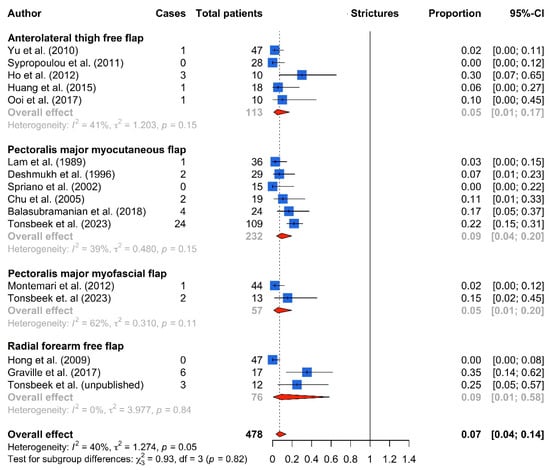 Stricture occurrence was most frequently reported in PMMC flap reconstructions (n = 33/232, 14%), followed by RFFF (n = 9/76, 12%), ALTFF (n = 6/113, 5%) and PMMF flap (n = 3/57, 5%) reconstructions. The meta-analysis did not identify a significant difference between the groups, with a pooled incidence of 9% in RFFFs (95% CI 1–58%), followed by PMMC flaps (9%; 95% CI 4–20%), PMMF flaps (5%, 95% CI 1–20%) and ALTFFs (5%, 95 CI 1–17%).