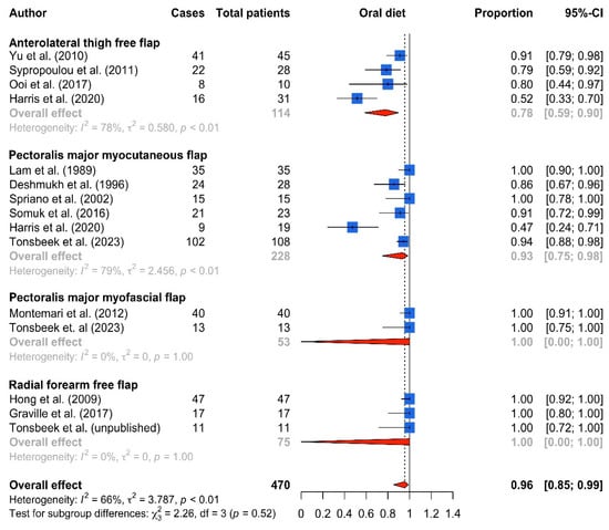 Forest plot of oral intake rates (either solid, soft or liquid diet) by flap type [5,9,11,12,13,20,22,24,25,29,31,32].