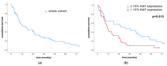 Regarding the cut-offs, we divided the level of Ki67 tumor expression into low (<15%) and high (>15%) to be able to better compare the influence of Ki67 expression to the overall survival and prognosis. The results from our univariate survival analysis, both via log-rank and Cox regression, proved the prognostic power of Ki67. The Ki67 tumor expression yielded significant survival advantages within the group with low Ki67 expression (31.2 vs. 11.1 months,