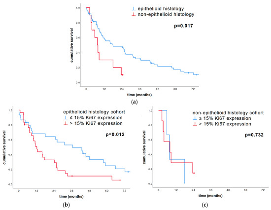 p = 0.732, for those with a low and high Ki67 tumor expression, whereas for the epithelioid patients, the median OS was 36.8 vs. 12.3 months with a low and high Ki67 tumor expression.