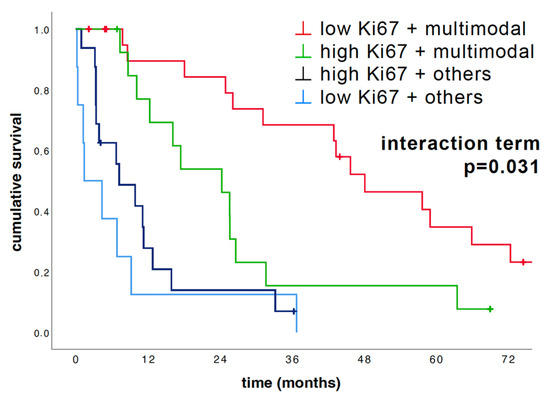 However, after multivariate analysis, only the treatment modality remained as an independent prognostic parameter. We showed a strong statistical power whether patients received multimodality treatment or other therapy concepts (HR 0.31, 95% CI 0.12–0.82, p = 0.019). In further testing, a significant interaction between Ki67 tumor expression (cut-off 15%) and multimodality treatment vs. other therapy options (interaction term, p = 0.031) was found, indicating a predictive relationship between Ki67 expression and multimodality treatment. The overall survival in this treatment subgroup differed strongly: Patients with a low Ki67 expression showed a significantly better survival with median OS of 48.1 months vs. 24.3 months for patients with a high Ki67 expression. In contrast, patients treated with other therapy options and low Ki67 expression showed worse survival with 1.4 month vs. 7.2 months in the subgroup with high Ki67 expression.