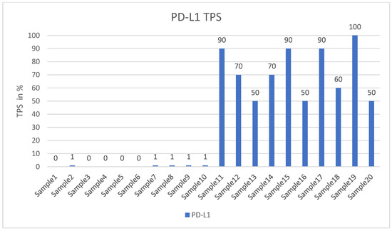 Our study used formalin-fixed and paraffin-embedded (FFPE) archived samples from the University Institute of Pathology, University Hospital Salzburg, and Paracelsus Medical University, Salzburg, Austria. Cases were randomly selected from our routine material, but they had to meet specific criteria. Each tumor was required to be a primary pulmonary adenocarcinoma, exhibiting either high PD-L1 expression (TPS > 50%) or negative PD-L1 expression (TPS < 1%), with no mutations or rearrangements in the target genes or gene regions according to our next-generation sequencing data (please see below for details). Figure 1 illustrates the distribution of the PD-L1 values.