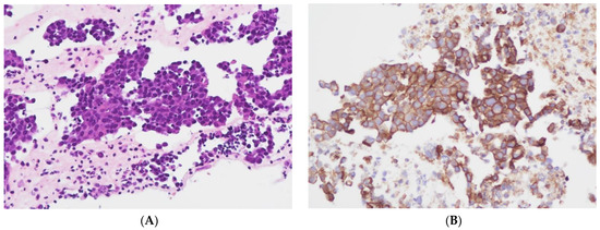 Cellblock of a pleural effusion with a pulmonary adenocarcinoma. (A): HE 200×. (B): PD-L1 (22C3) positive, TPS = 100% (Sample 19 in Figure 1) 200×.