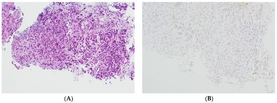 Lung biopsy fragments of a pulmonary adenocarcinoma. (A): HE 100×. (B): PD-L1 (22C3) negative, TPS = 0% (Sample 6 in Figure 1) 100×.