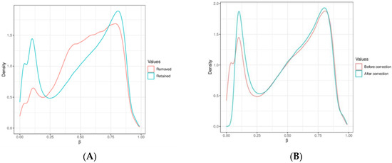 (A) Compares the methylation β values that were removed with those that were retained. (B) Demonstrates the effect of Dasen normalization on CpG methylation values, which reduces technical biases and enhances the reliability of DNA methylation data. The X-axis represents beta values (methylation level), while the Y-axis shows density (methyl group concentration) in specific genomic regions.