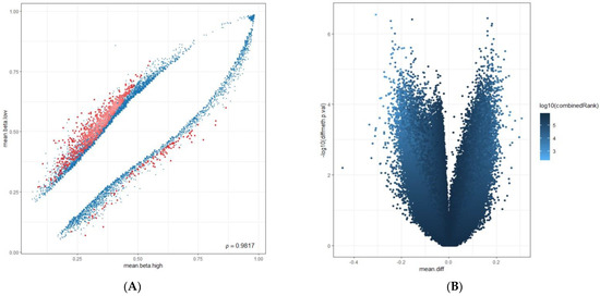 (A): The scatterplot shows the mean methylation difference between the PD-L1 high and low group in blue, with a combined rank among the top 1000 sites in red. The proportion of methylation (mean.beta.low and mean.beta.high) is used as a variable on the Y- and X-axes. (B): Volcano plots compare methylation between PD-L1 high and low groups using pairwise comparisons, with colors based on combined p-values to assess the overall significance. The X-axis shows the difference in average methylation (mean.diff), while the Y-axis shows the identification of differentially methylated CpG sites (−log10 (p-value)), (diff.meth).