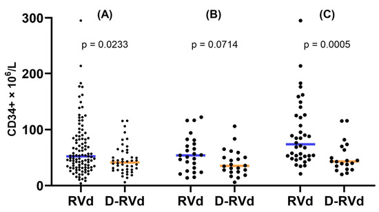 Peripheral number of CD34+ cells at the day of apheresis for the RVd and D-RVd groups; horizontal lines indicate the respective median value: (A) all patients; (B) patients mobilized with gemcitabine + G-CSF; (C) patients mobilized with vinorelbine + G-CSF.